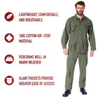 • These breathable fatigues are made of durable, 100% cotton rip-stop material that’ll keep you cool while enduring a day’s worth of work or play.
